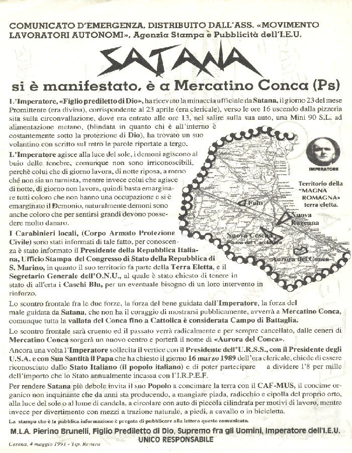 L’Imperatore rende noto che il giorno 04 del mese Fiorito dell’anno 1, in veste ufficiale parlerà alle ore 19 in P.zza Rossini a Mercatino Conca (PS), il tema sarà delinquenza, mafia, vagabondaggine, parassitismo, illustrerà i metodi per liberare e proteggere gli onesti da queste calamità.