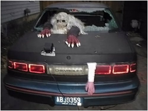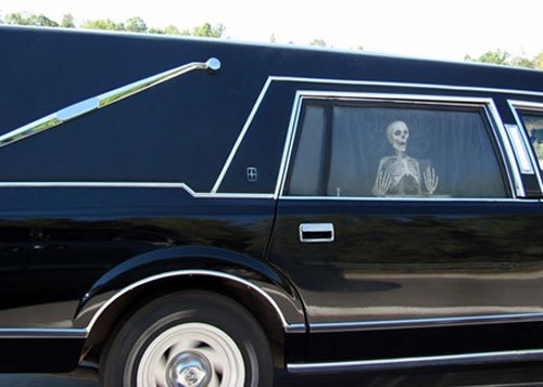 Uno scherzetto che non si può non fare se “hai” un carro funebre oppure una berlina nera: uno scheletro che guarda dal finestrino… booo