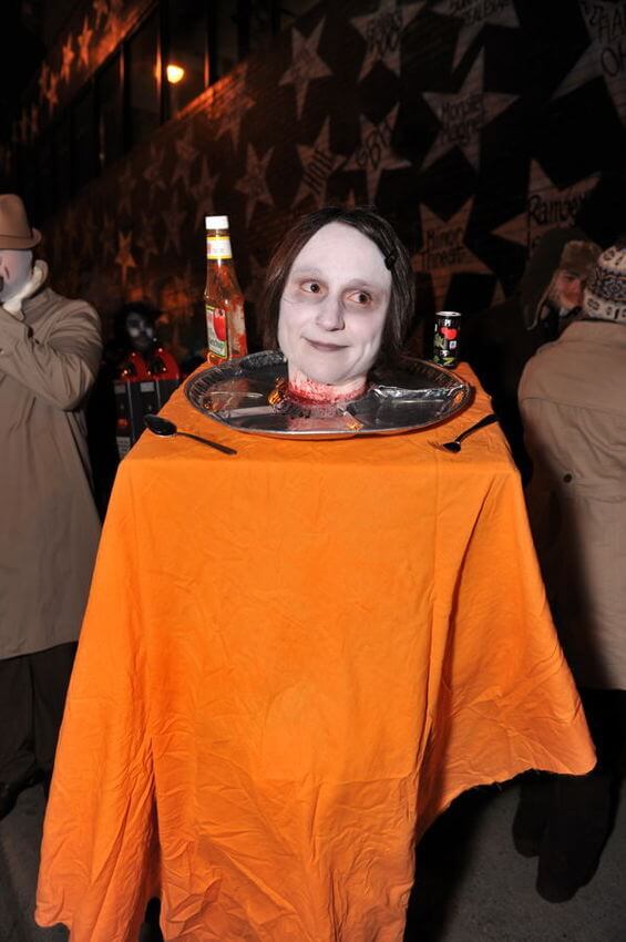 un travestimento scenografico relativamente semplice da realizzare: servono un asse di legno in cui far passare la testa, una tovaglia con buco in mezzo, e trucco bianco per sembrare un cadavare e un po’ si sangue finto nel collo mozzato..