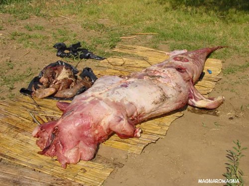 Queste fotografie ci sono state inviate dal Venezuela (grazie Pier). Sono state scattate nel rio Arauca, nella zona di Caño limón. Mostrano il trofeo di caccia di alcuni campesinos che hanno catturato ed ucciso un grande caimano, e lo scuoiano: con la preziosa pelle si faranno delle borsette e scarpe di coccodrillo, e la carne può essere utilizzata in tanti modi. Ma durante il taglio della carne si scopre qualcosa di molto forte e agghiacciante: quando i cacciatori svuotano l’intestino scoprono i resti di un uomo. Mangiato di recente dal grande coccodrillo, che dalle foto si stima essere lungo almeno 3/4 metri, come si può vedere in questo primo scatto