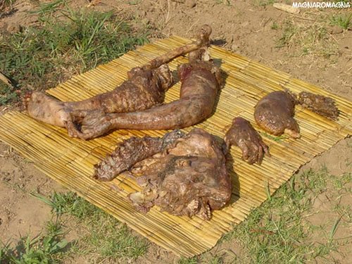 I resti del povero uomo al “completo”: si riconosce anche una mano e resti della faccia (notare l’arcata dentale), non ancora digeriti. Il coccodrillo vittima del mercato delle borsette si è vendicato in anticipo del povero malcapitato. Pace all’anima sua. Che ne pensate?